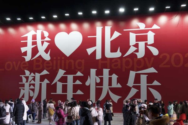 2024年12月31日,旅客们在798电子广场巨幅口号“我爱北京,新年知足”眼前合影迷恋。 中青报·中青网见习记者 王梓元/摄