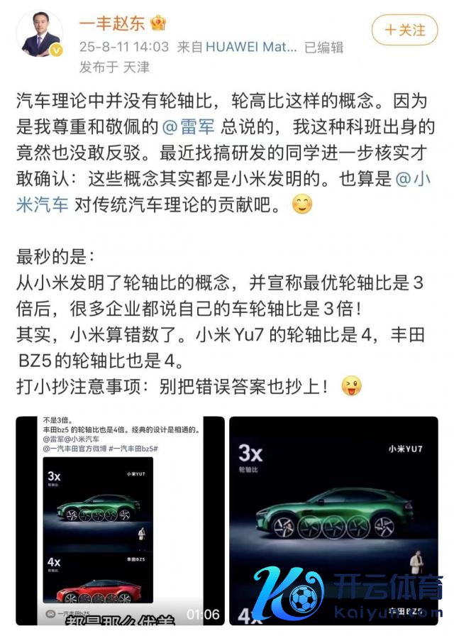 恰是在这么的商场与居品布景下,"轮轴比" 争议的出现更显耐东谈主寻味。一汽丰田企划部部长赵东指出,小米宣传的 " 3 倍轮轴比" 按其界说骨子应为 4 倍,且这一意见并非传统汽车表面悉数。但一个要津细节隔断忽视,小米 "轮轴比" 意见自 2023 年底便已出现,为何一汽丰田选拔在 bZ5 上市后销量低迷的节点淡薄质疑?这一时期点的选拔很难不让东谈主将其与 bZ5 的销量压力研讨起来。