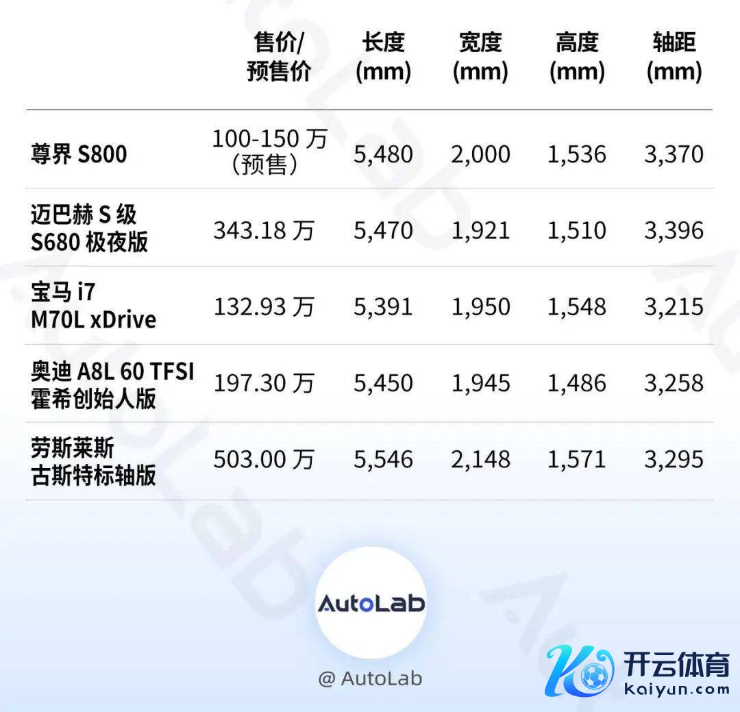为了更简单的让全球感受尊界 S800 的体量感,咱们也拿它和其他已售车型作念个对比。