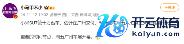 【CNMO科技音尘】11月12日,数码博主@小马甲不小 爆料称,小米SU7的第十万台车瞻望将在广州录用,时辰可能是本周五六七这三天中的某一天。广州车展将于11月15日(本周五)开幕,因此小米SU7的第十万台车有很大可能会在车展上录用,况且有可能由雷军躬行交车。