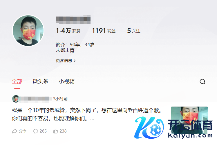 近日九游体育娱乐网,一位网友自称“10大哥城管被清退”,赓续发布的几条实质齐激发了大批网友的围不雅和接续。