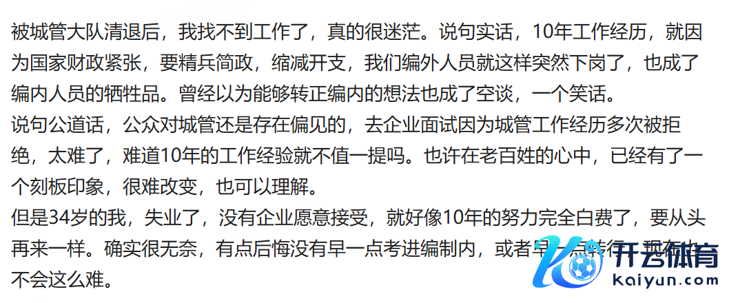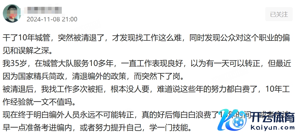 这位网友暗示,我方本年35岁,在城管大队责任了10多年,原来以为我方不错转正,遵守最近因为“编外清退”的策略,丢掉了这份责任。