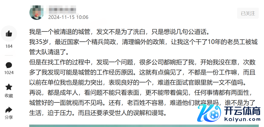 不外,也有网友帮他分析,责任难找也不一定与城管阅历奏凯关系,他的年齿、关于一份新责任强度的适配性、当下经济环境,齐是影响他找新责任的原因。