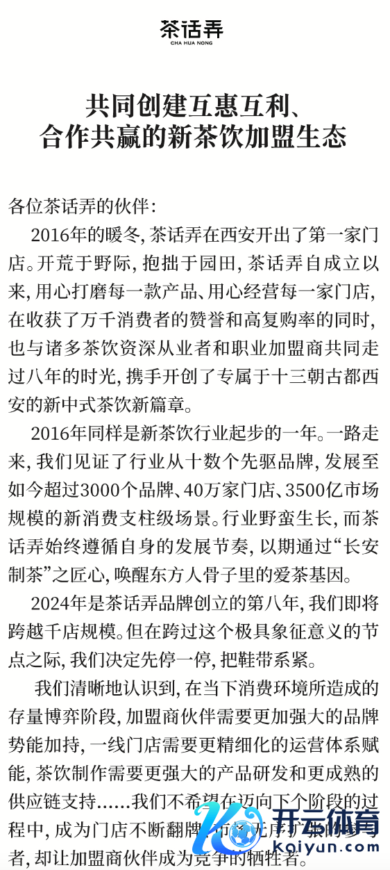 11月22日,茶话弄发布里面信称,“咱们明晰地意识到,在当下消耗环境所变成的存量博弈阶段,加盟商伙伴需要愈加宽阔的品牌势能加持……咱们不但愿在迈向下个阶段的经由中,成为门店握住翻牌、阛阓无序彭胀的参与者,却让加盟商伙伴成为竞争的阵一火者。”