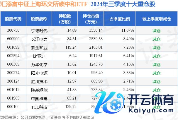 汇添富中证上海环交所碳中庸ETF为指数型-股票基金,把柄最新一期基金季报剖析,该基金金钱竖立:股票占净值比99.87%,无债券类金钱,现款占净值比0.2%。基金十大重仓股如下: