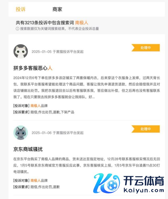 在黑猫投诉平台上,对于南极东谈主的投诉多达 3213 条,问题主要触及虚假宣传、居品性量差、虚假发货、退款难等情况。