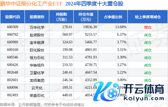 鹏华中证细分化工产业ETF为指数型-股票基金,笔据最新一期基金季报披露,该基金财富竖立:股票占净值比99.16%,无债券类财富,现款占净值比0.87%。基金十大重仓股如下: