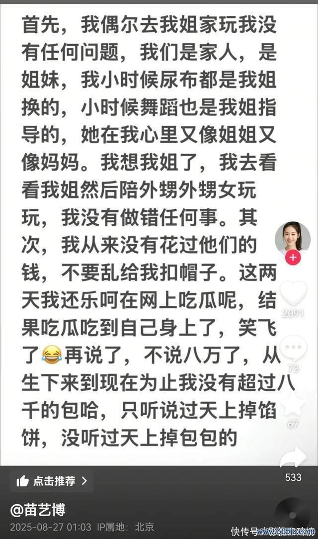 随后,苗苗的妹妹也发文辟谣:我偶尔去我姐家玩我莫得任何问题,我从来莫得花过他们的钱。不说八万了,从生下来到当今律例我莫得跨越8000块的包哈。