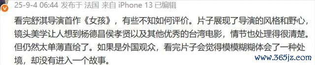 与《日掛中天》大获好评不同,舒淇自编自导的《女孩》首映口碑不太乐不雅,四星五星有,但也不少东谈主给出了一两星的差评。