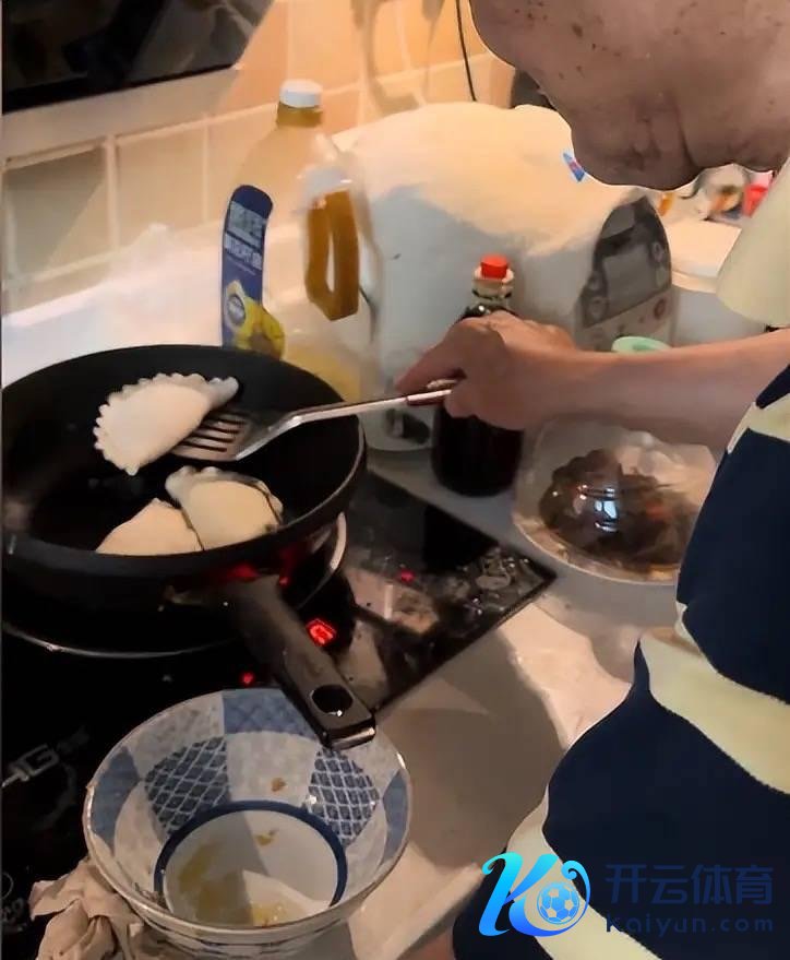 牛犇本分以为我方烹调的饭菜更相宜个东谈主口味,他正在厨房用电磁炉制作韭菜盒子。灶台上能看到些许油污,并未被清算得十分整洁。
