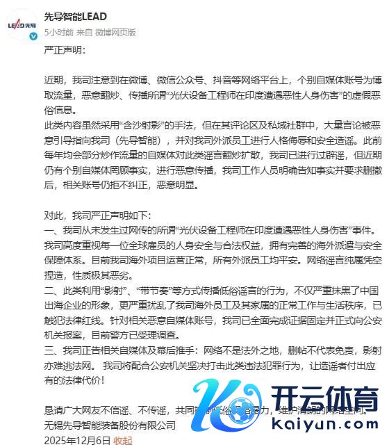 12月6日,先导智能官方微博发布严正声明称,从未发生过网传的所谓“光伏配置工程师在印度遇到恶性东说念主身伤害”事件。当今公司国外模样运营泛泛,系数外派职工均祯祥。针对计议坏心传播造行恶俗信息的自媒体账号,公司已全面完成凭据固定并显露向公安机关报案,当今警方已受理访问。