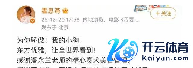 霍念念燕在应付平台发文称,“为你自傲!我的小狗!东方优雅,让全全国看到!”