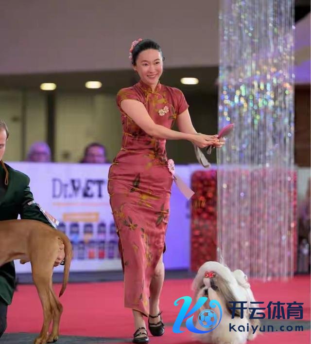 底本,霍念念燕教导她的小狗进入一项狗狗的国外赛事,没料到她的西施犬在一万一千只狗中,脱颖而出,被选为冠军之狗。相片中只见霍念念燕身穿大红色开衩旗袍,盘着的头发上别着美丽的花团,躯壳玲珑有致,优雅地牵着我方的白色爱犬。不得不说,所有这个词画面照实相配温顺!