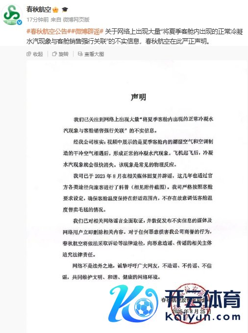 春秋航空:网传“将夏令客舱内出现的时常冷凝水汽景色与客舱销售强行关联”为伪善信息现金九游体育app平台春秋航空:网传“将夏令客舱内出现的时常冷凝水汽景色与客舱销售强行关联”为伪善信息