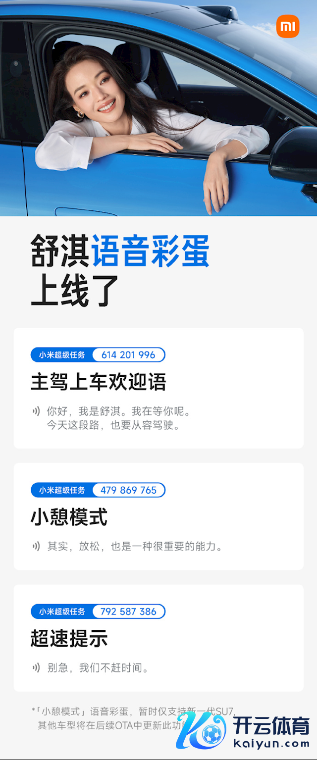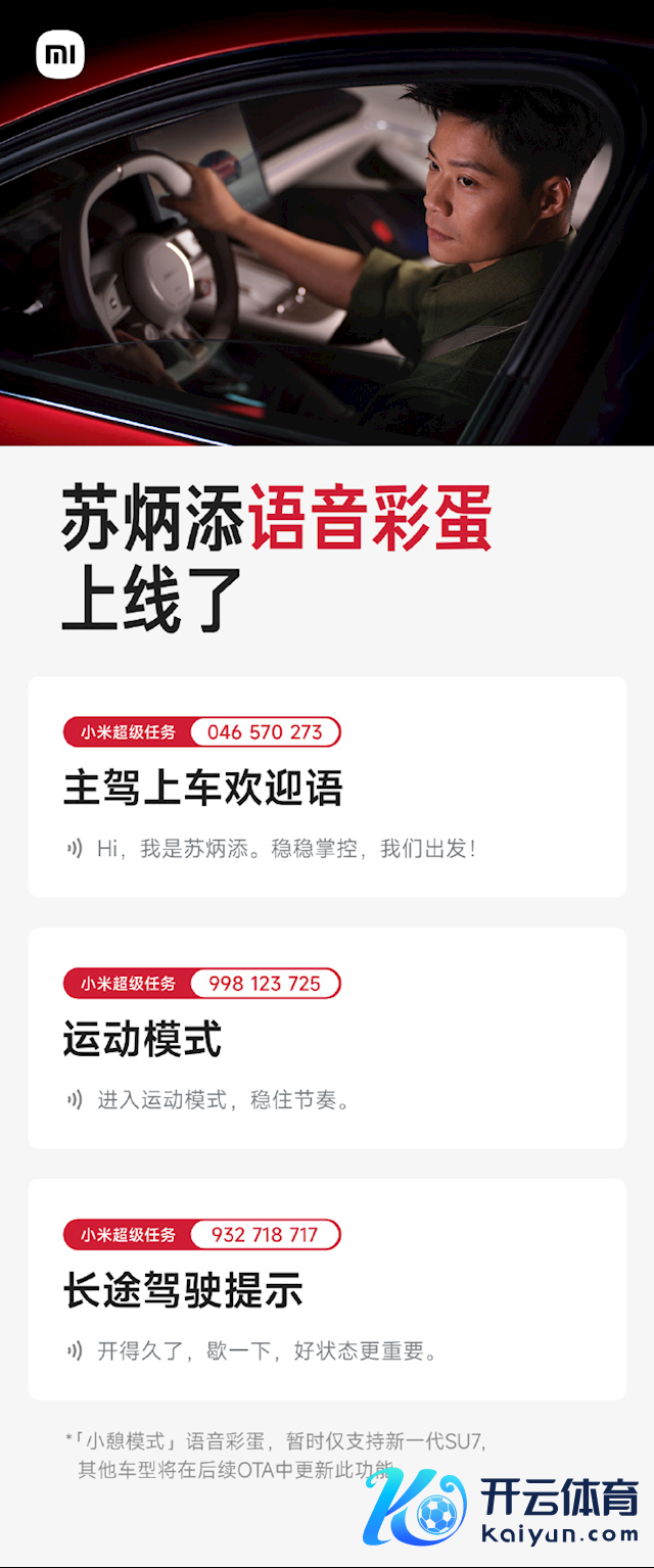 快科技3月24日音信,日前九游体育app娱乐,小米汽车布告,新一代SU7双代言东说念主——苏炳添、舒淇的语音彩蛋已认真上线。